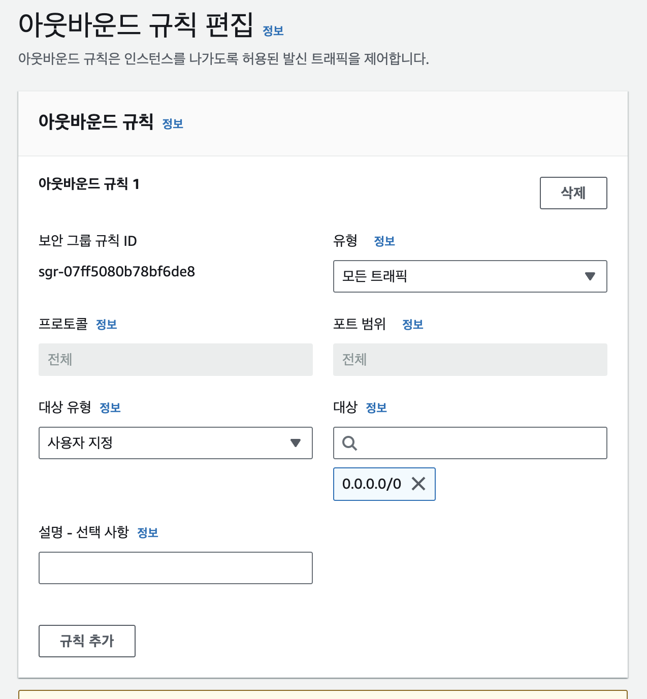 위처럼 설정 했는데 안된다. 인스턴스의 주소가 제대로 되었는지 확인하고 아웃바운드 규칙의 유형이 모든 트래픽인지 확인!!(글쓴이는 아웃바운드 규칙이 변경되어서 많은 시간을 허비하였다 ㅠㅠ)