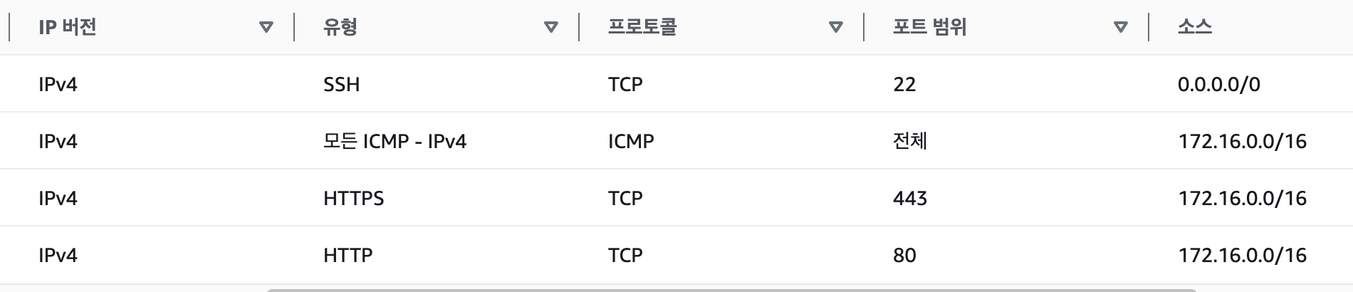 인바운드 규칙 4-> 유형 : 모든 ICMP -IPv4 -> 소스 유형 : 사용자 지정 -> 소스 : VPC CDIR로 설정