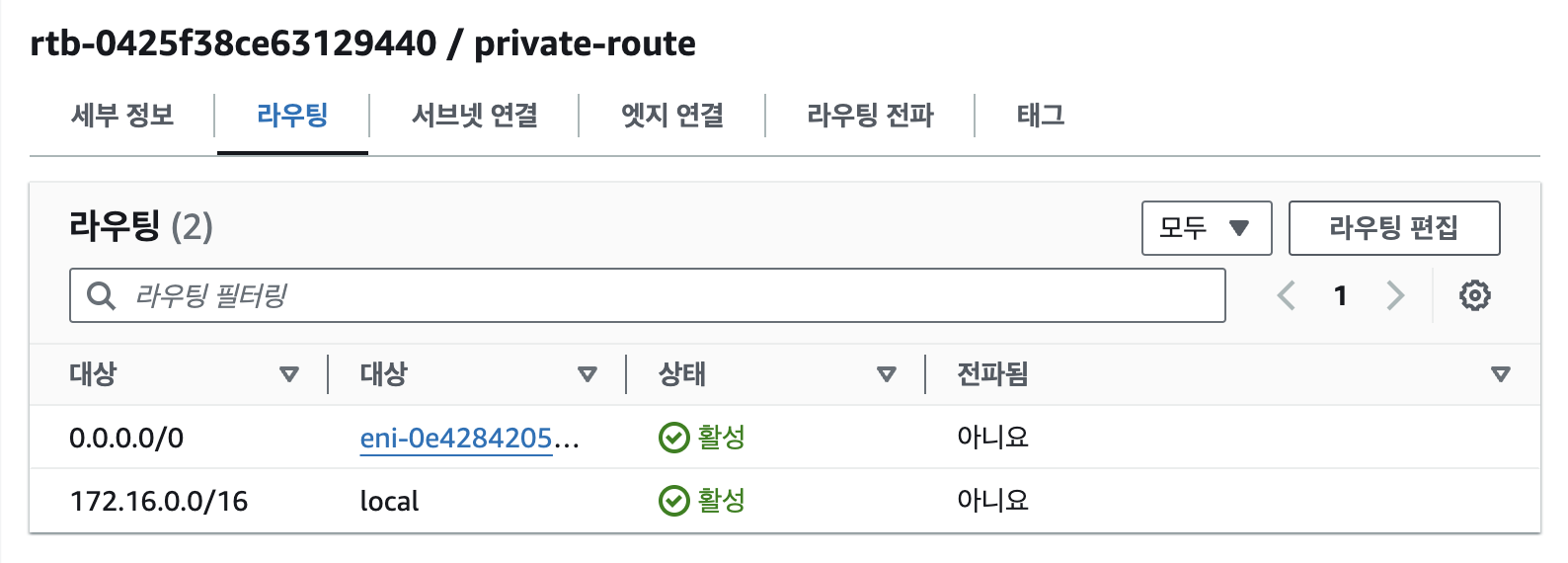 VPC에서 라우팅 테이블에 private-route를 생성해준다.
