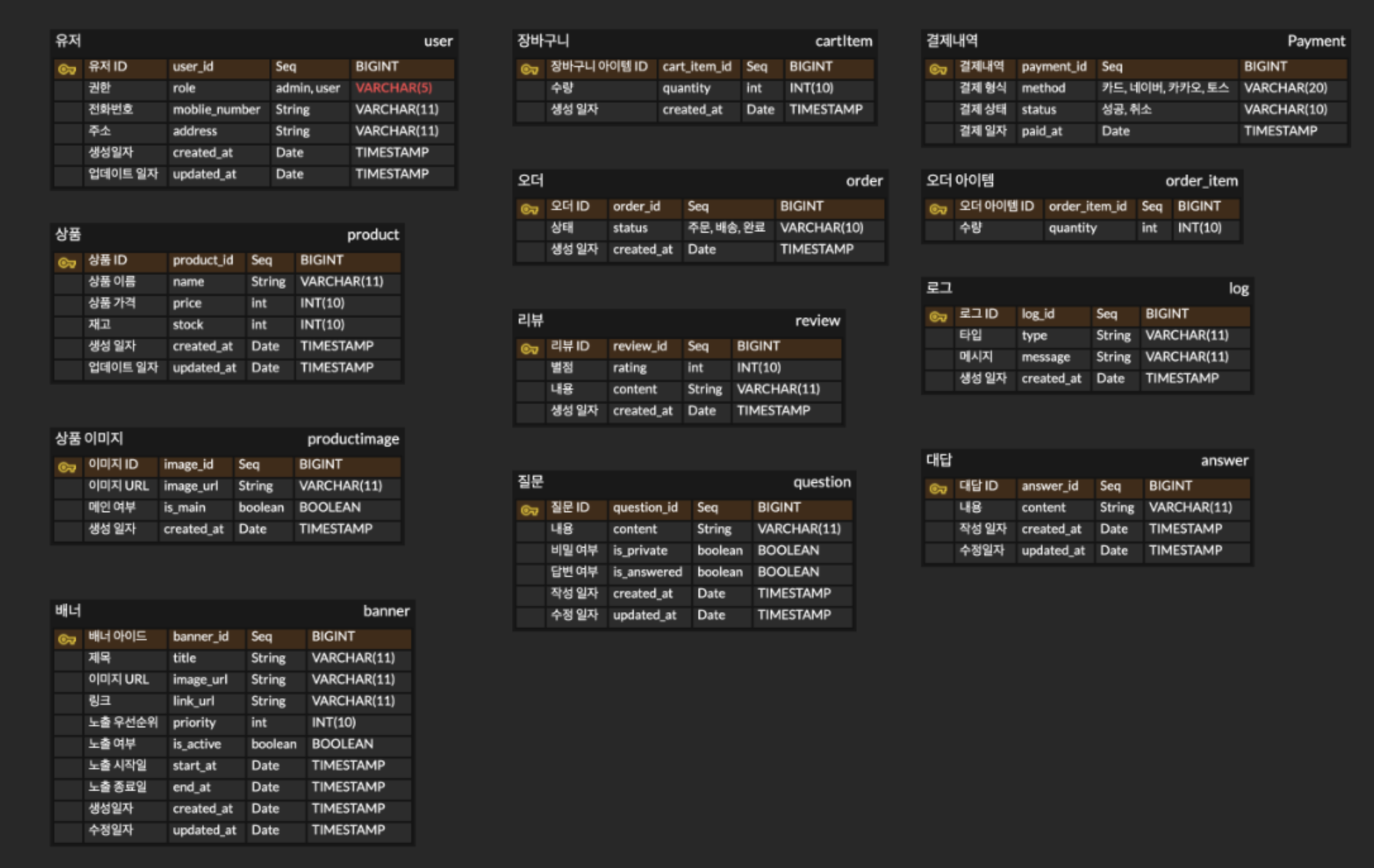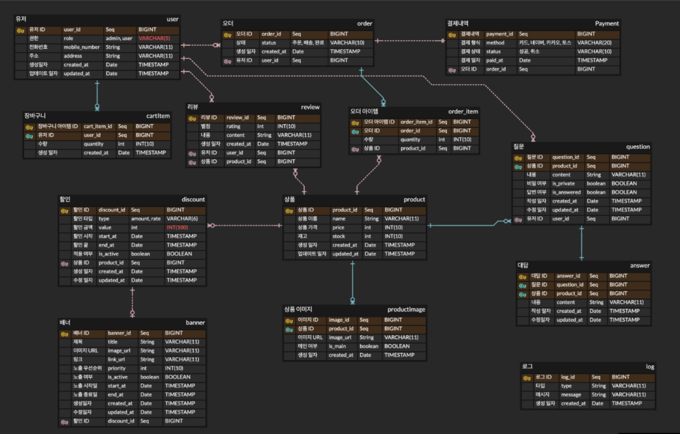 | Review (리뷰) | 유저가 남긴 상품 리뷰 담당 |