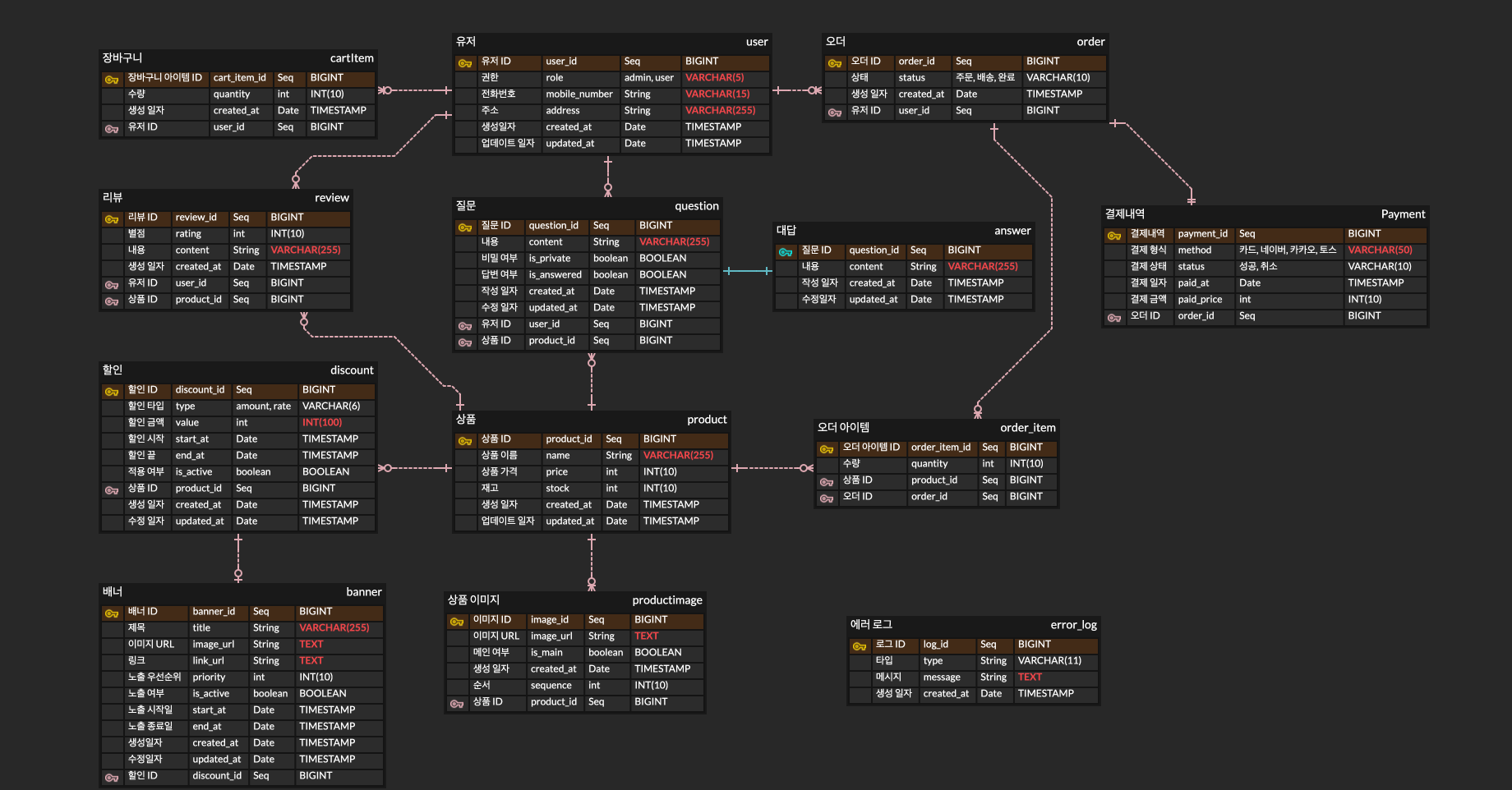 | ErrorLog (로그) | 시스템 이벤트, 에러, 행동 기록 등 수집 독립적인 엔티티 |