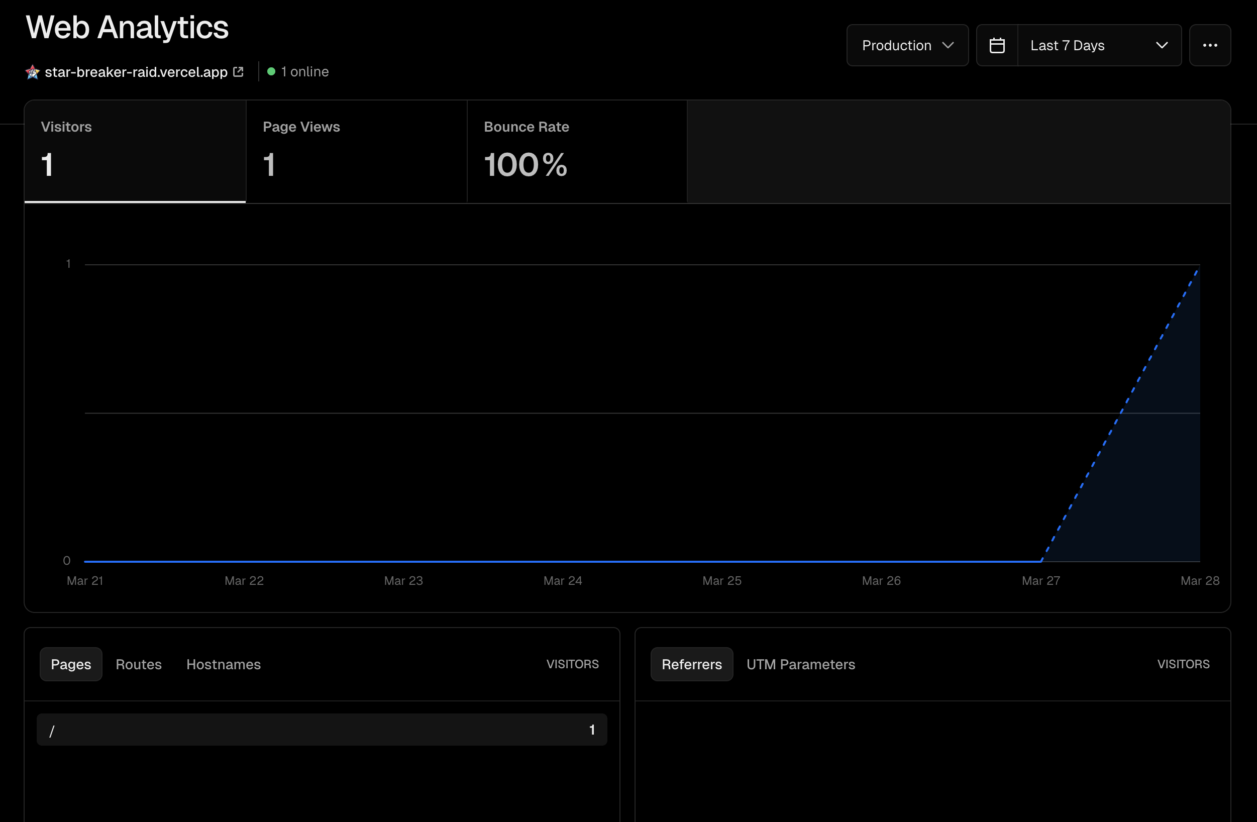 이제 Star-Breaker-Raid에 접속한 사용자의 방문 기록을 Vercel Dashboard에서 실시간으로 확인할 수 있습니다