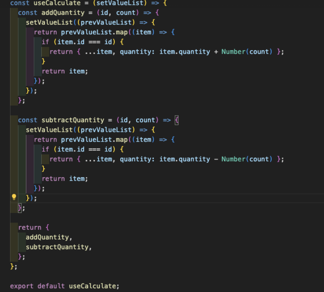 이렇게 컴포넌트에서 useCalculate을 호출해준 후, 함수를 가져와 쓸 수가 있다 (자주 쓰이는 함수를 hook으로 만들어주고 재사용할 수 있어 간편하고 보일러 플레이트를 줄일 수 있삼)