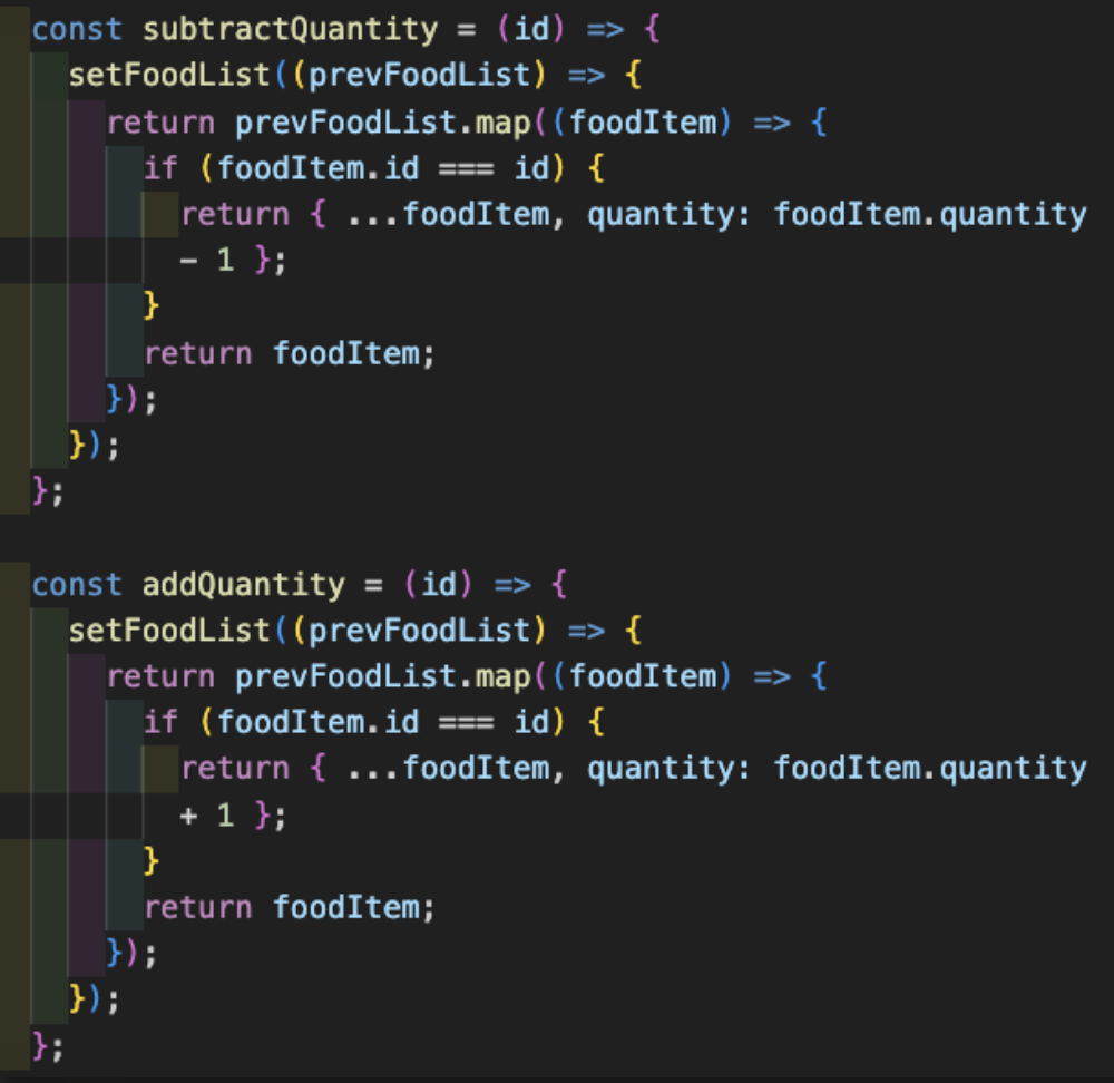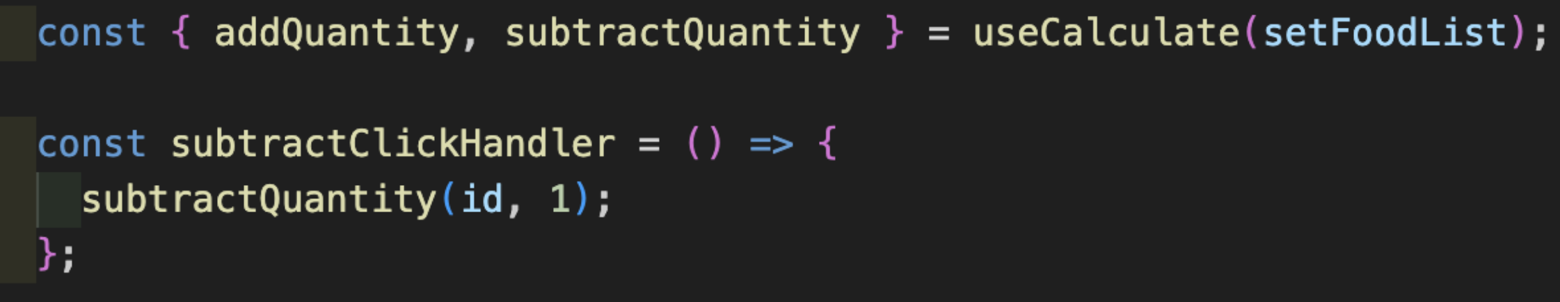 이 훅 안에 addQuantity, subtractQuantity라는 함수를 추가해주고, 리턴을 해줬음