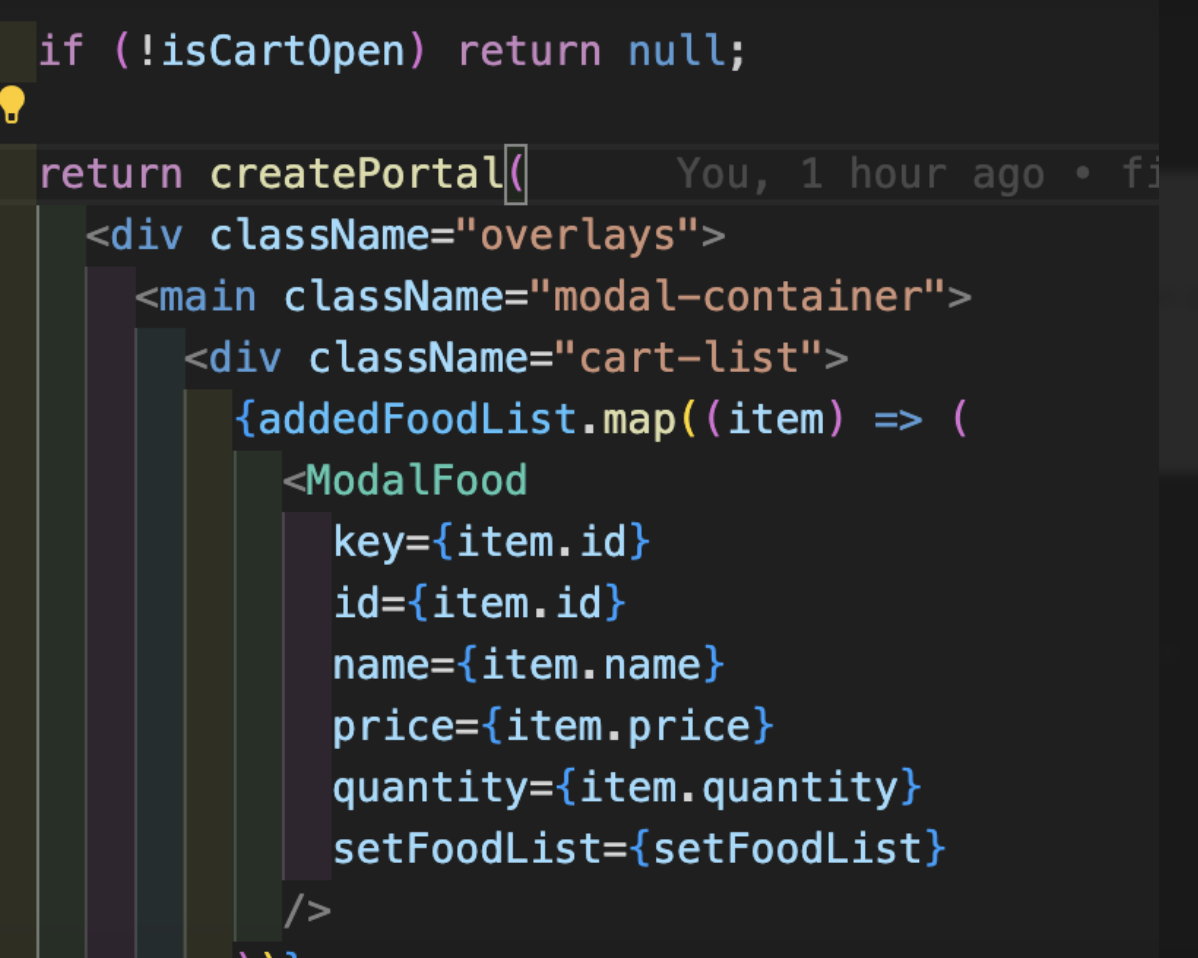 그 다음, 모달 컴포넌트 내에서 리턴에 createPortal을 이용하여 렌더링될 부분을 첫번째 인자로 넣어주고, 두 번째에는 포탈을 통해 이동할 부분을 넣어준다(overlays-modal은 id로 넣어줬으니 getElementById로 사용)