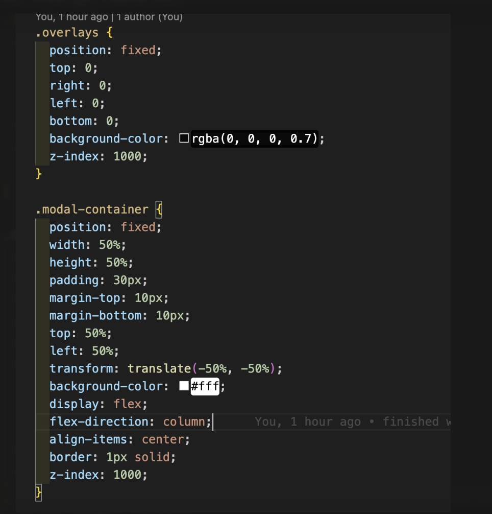 overlays 부분은 반투명하면서 어둡게 깔릴 배경을 담당하고, modal-container 부분은 하얗게 모달로써 보여질 부분을 의미한다