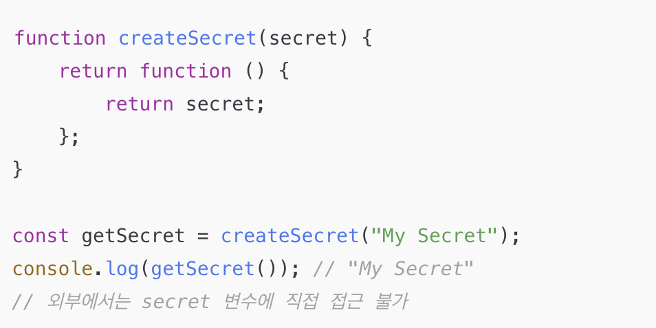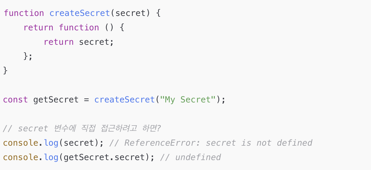 이렇게 함으로써, secret은 함수 내부에 선언된 로컬 변수이기에 외부에서 접근이 불가하다!