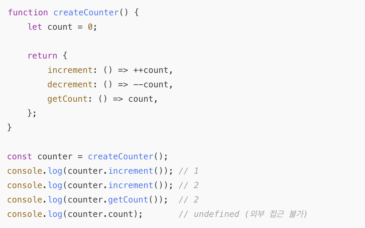 : 외부 함수가 종료된 후에도 외부 함수의 변수를 클로저를 통해 계속 사용할 수 있음