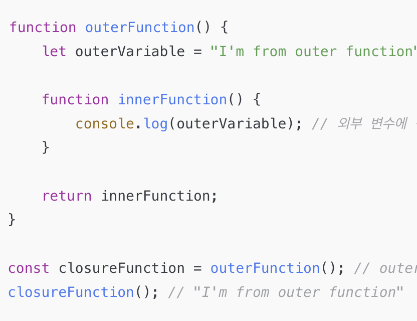 : 함수 내부에서 선언된 변수가 외부 함수의 스코프에 접근할 수 있음