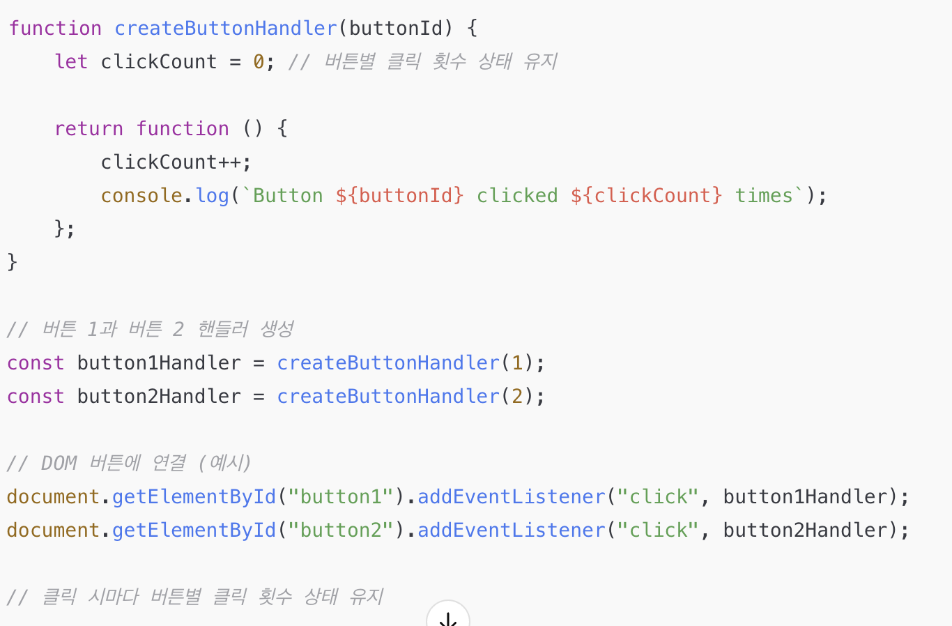 : createButtonHandler 내의 clickCount는 각 버튼마다 독립적으로 상태 유지