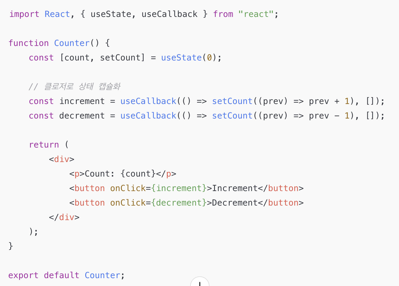 위의 코드에서는 Counter라는 컴포넌트 함수에서 정의된 count와 setCount 상태가 있다.