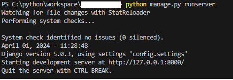 예제로 만든 장고 프로젝트를 실행하면 서버가 실행된다.