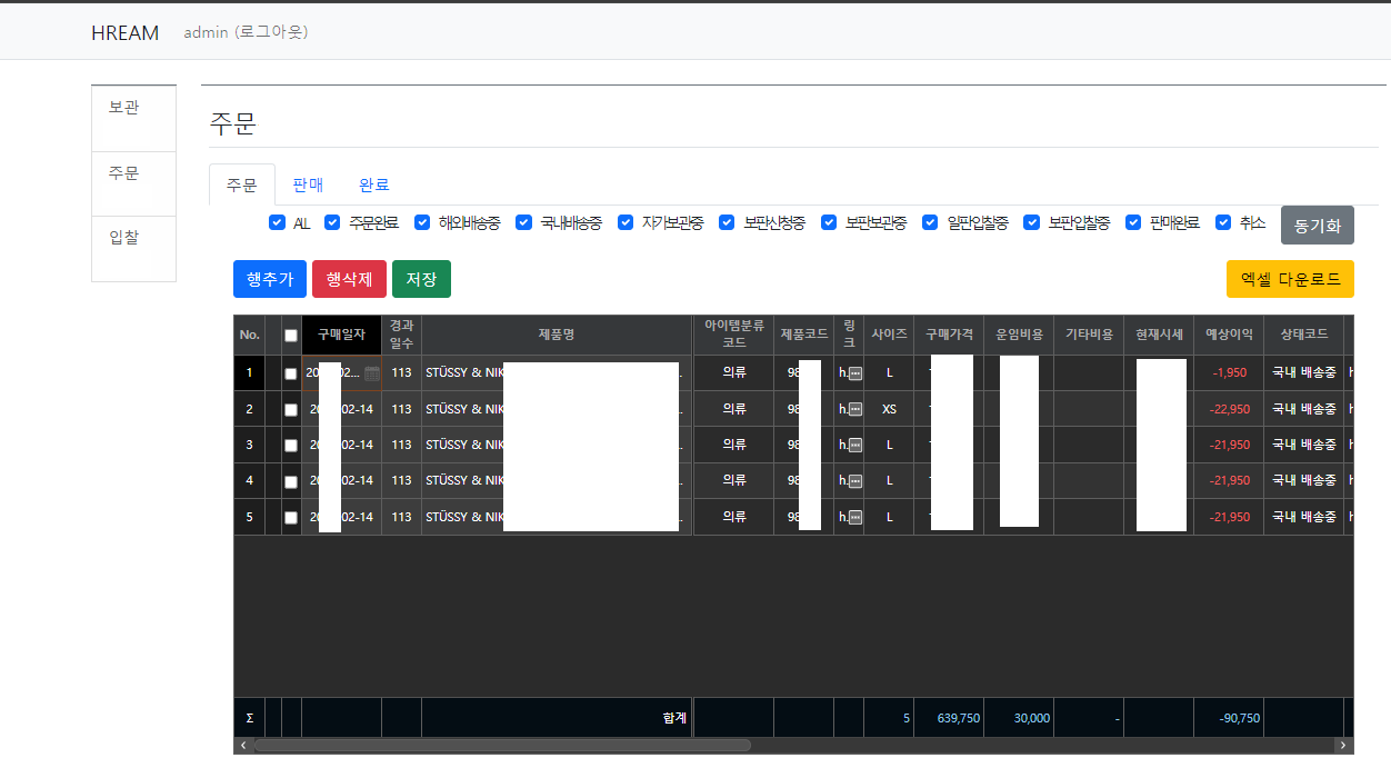 내가 보유하고 있는 상품의 목록을 관리하기 위한 목록을 그리드를 활용하여 구현하였다. 간단한 DB와 CRUD기능을 위한 api를 각 모듈 views에 구현 하였다.