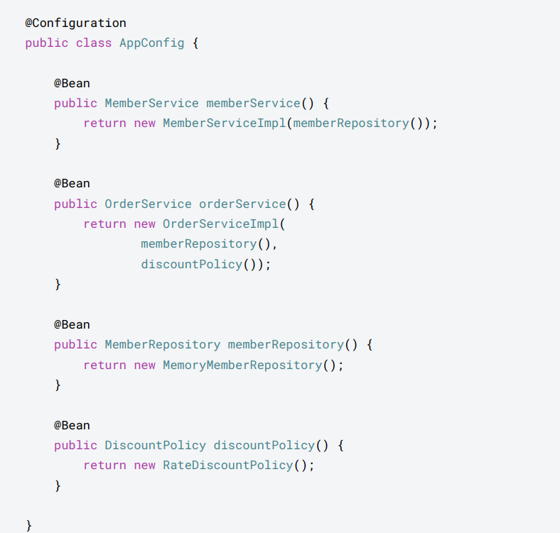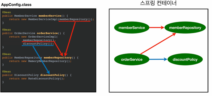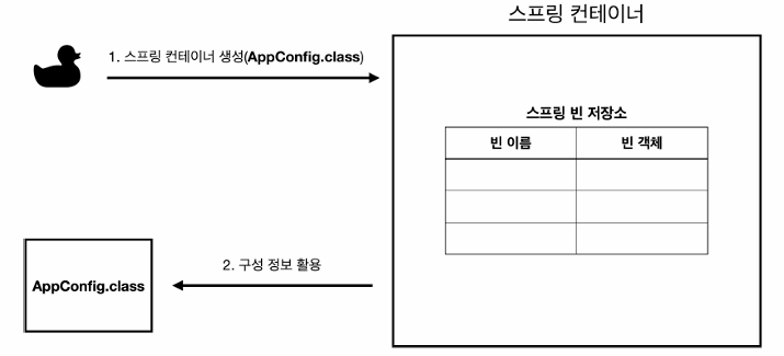 이전시간에 설정했던 AppConfig파일 즉 스프링 컨테이너는 아래와 같이 구성된다.