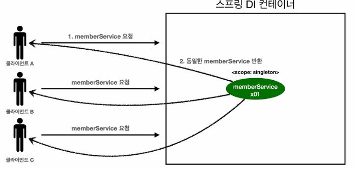 : 기본 스코프, 스프링 컨테이너의 시작과 종료까지 유지되는 가장 넓은 범위의 스코프이다.
