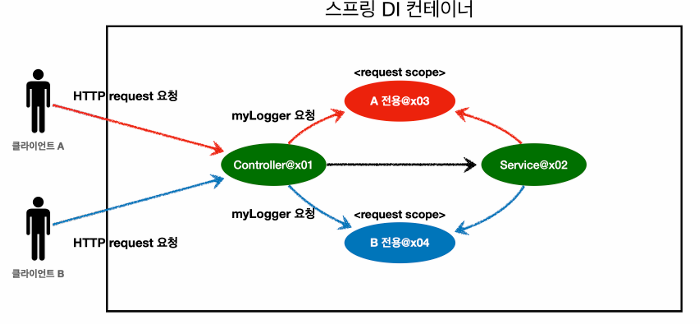 @Scope(value = "request") 를 사용해서 request 스코프로 지정했다. 이제 이 빈은 HTTP 요청 당 하나씩 생성되고, HTTP 요청이 끝나는 시점에 소멸된다.