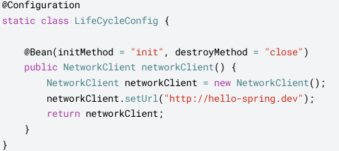코드를 고칠 수 없는 외부 라이브러리를 초기화, 종료해야 하면 @Bean의 initMethod사용하자.