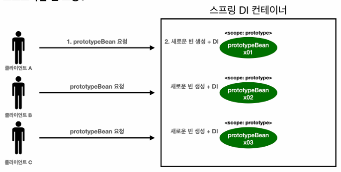 : 스프링 컨테이너는 프로토타입 빈의 생성과 의존관계 주입까지만 관여하고 더는 관리하지 않는 매우 짧은 범위의 스코프이다.