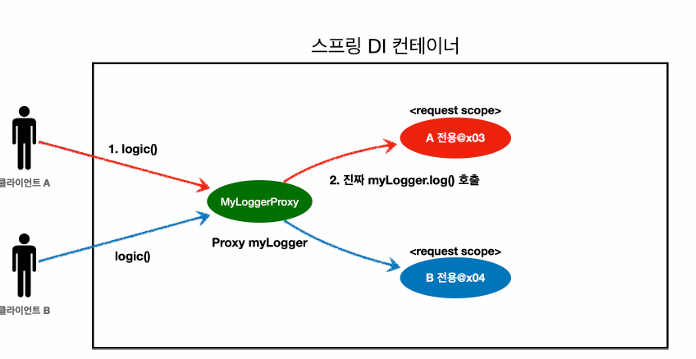 저렇게 MyLogger Class를 ObjectProvider형식인 myLoggerProvider 생성 해두면 직접 myLoggerProvider.getObject()을 호출하는 시점까지 request scope 인 MyLogger Class의 생성을 지연할 수 있어 우회가 가능하다.