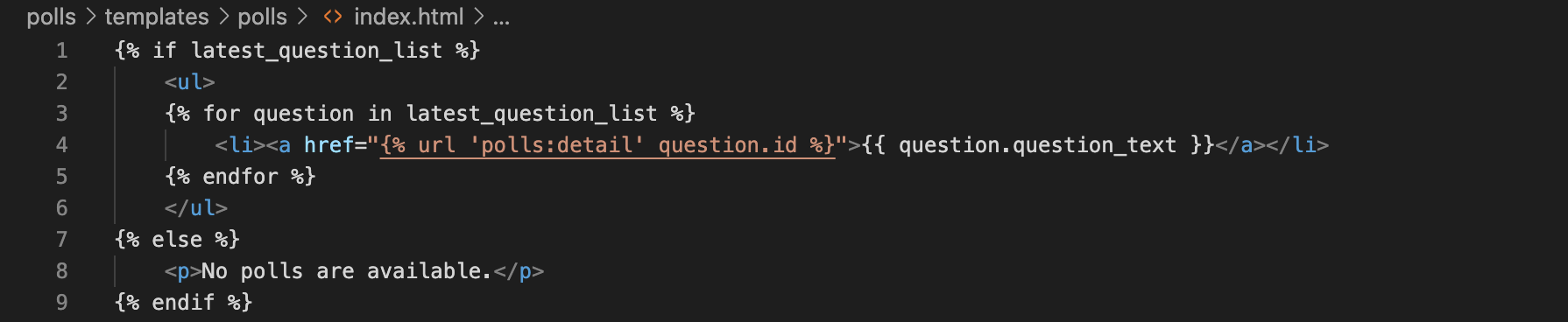 templates/polls 에 index.html 파일 생성 후 코드 작성