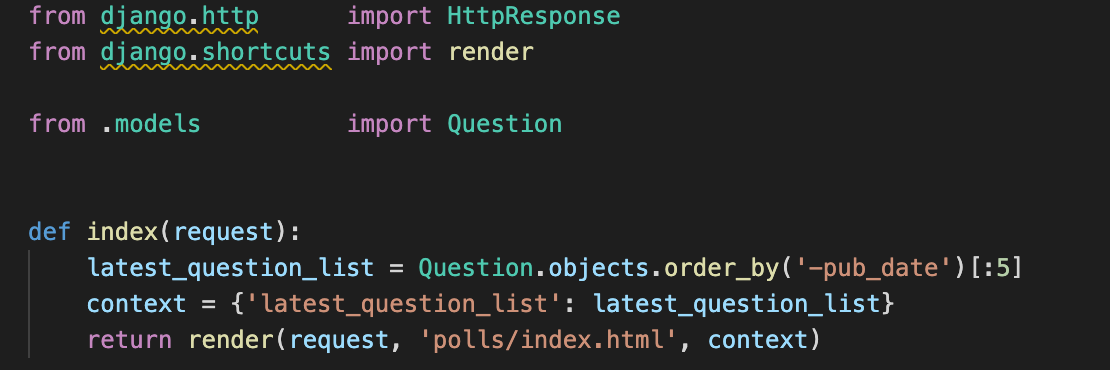 이 코드는 polls/index.html 템플릿을 불러온 후, context를 전달합니다. context는 템플릿에서 쓰이는 변수명과 Python 객체를 연결하는 딕셔너리 값입니다.