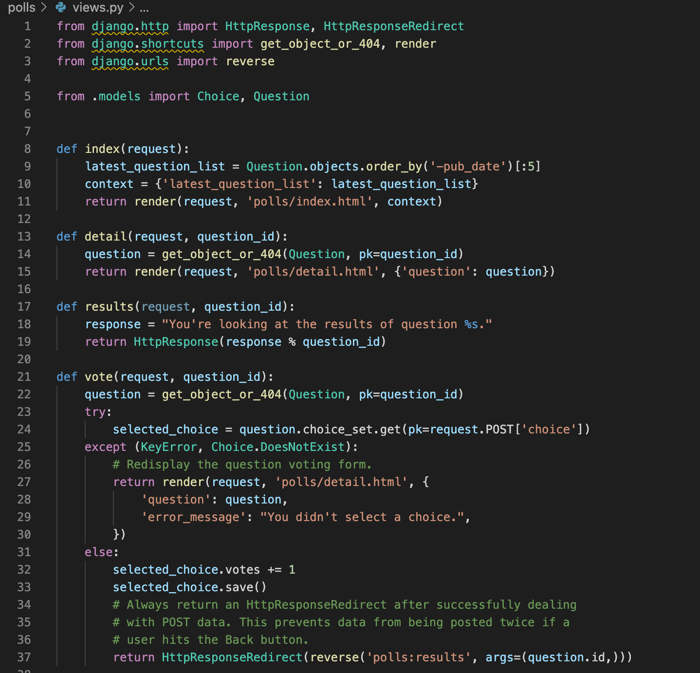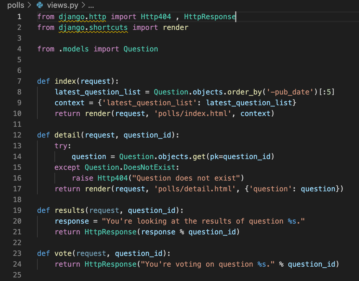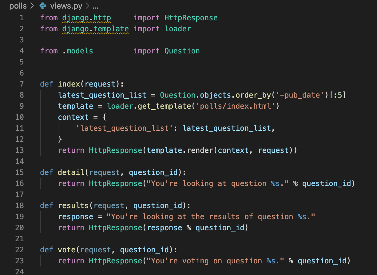 모든 뷰에 적용한다면, 더 이상 loader와 HttpResponse를 임포트하지 않아도 됩니다. (만약 detail, results, vote에서 stub 메소드를 가지고 있다면, HttpResponse를 유지해야 할 것입니다.)