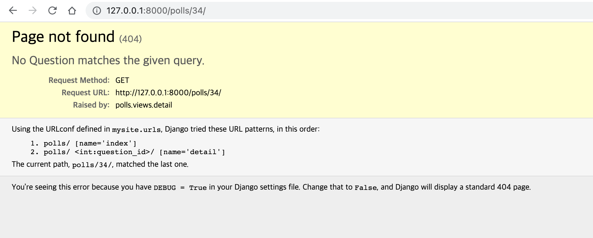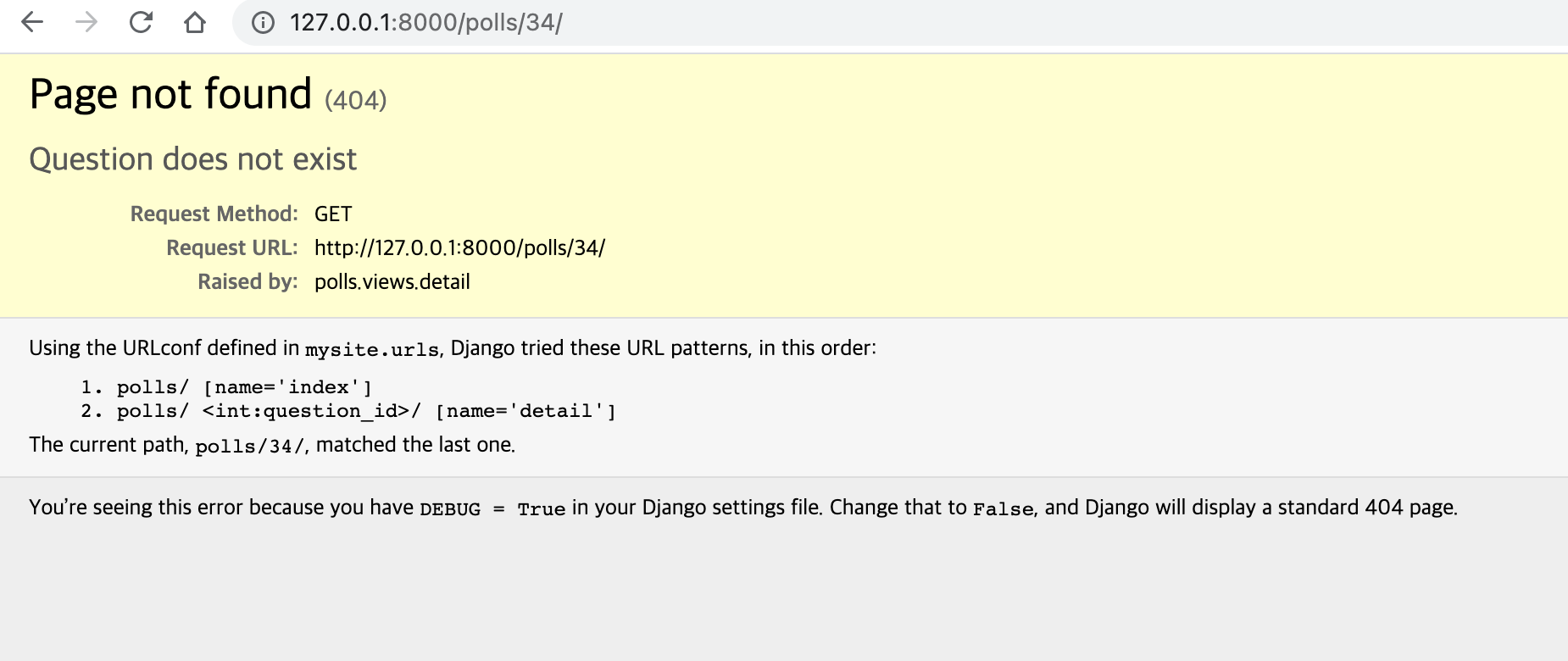 뷰는 요청된 Question ID 가 없을 경우 Http404 예외를 발생시킵니다.