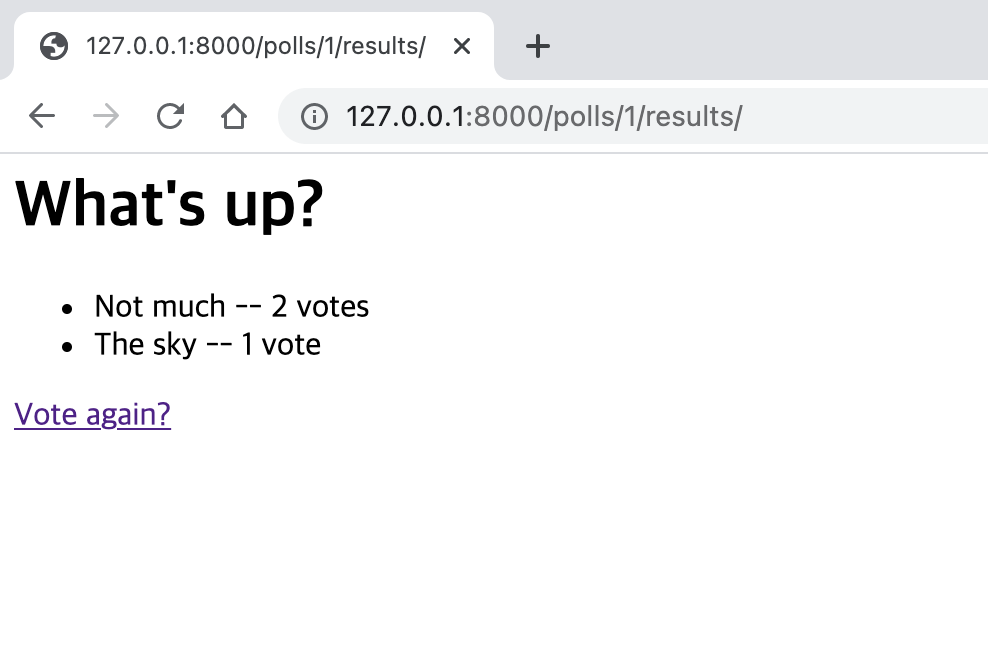 어떤 이가 설문조사에 설문을 하고난 뒤에는, vote() 뷰는 설문조사 결과 페이지로 리다이렉트합니다. 그 뷰를 작성해봅시다: