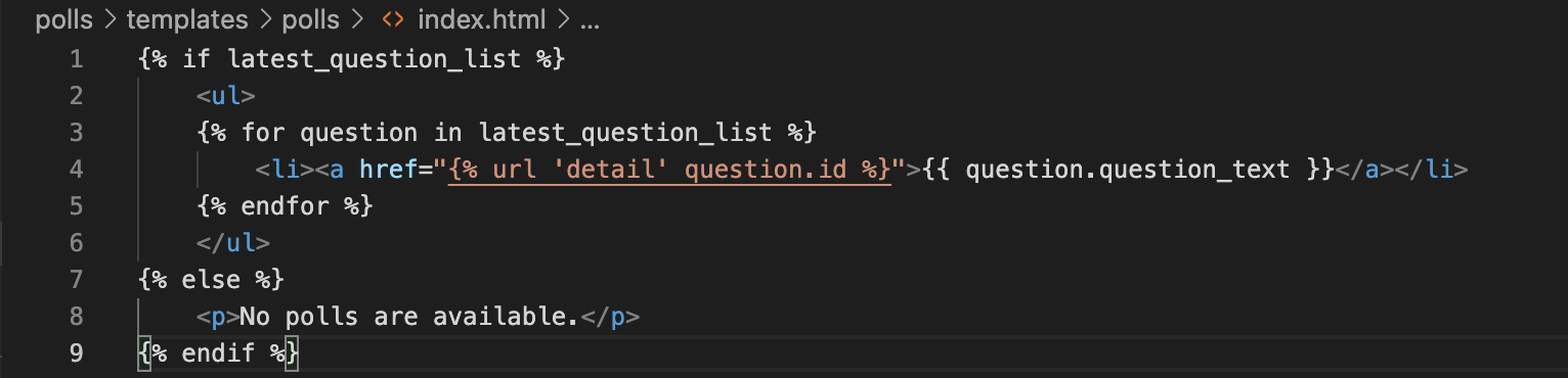 <li><a href="{% url 'polls:detail' question.id %}">{{ question.question_text }}</a></li>