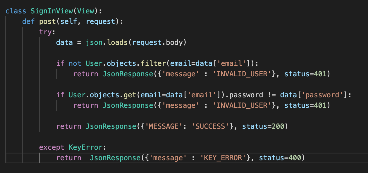 - 계정이나 패스워드 키가 전달되지 않았을 경우, {"message": "KEY_ERROR"}, status code 400 을 반환합니다.