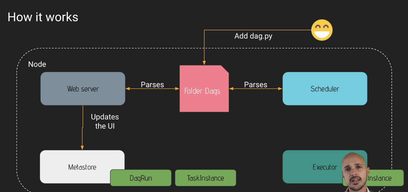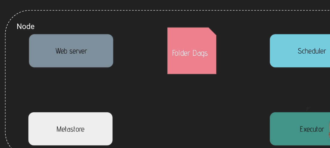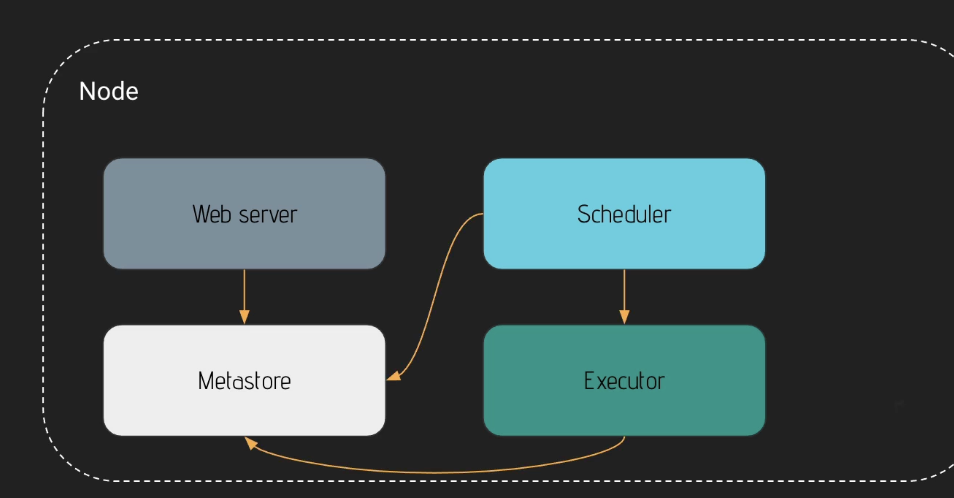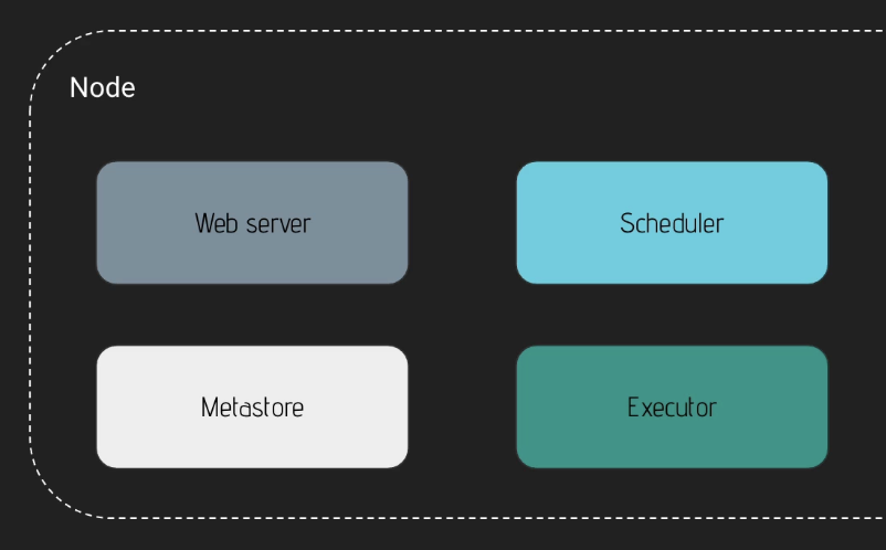 하나의 노드는 Web Server와, Scheduler, MetaStore, Executor로 구성됩니다.