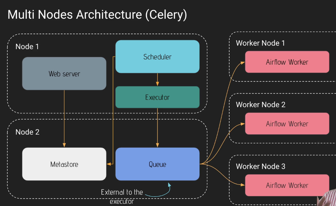 Executor에겐 내부 Queue가 있습니다. 이 Queue는 Executor의 일부입니다. 만약 Local Executor를 사용할 경우, Queue 안의 Task가 순서대로 실행되는 방식입니다. 이 One Node Architecture 구조는 훌륭하지만, 다양한 데이터파이프라인을 처리하기에는 스케일링이 필요합니다.
