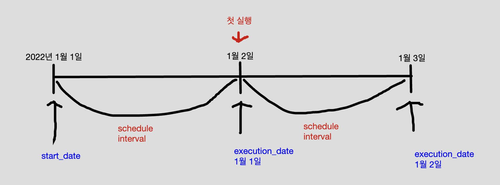 에어플로우에서 Start_date와 Schedule_interval은 처음에는 이 파라미터가 혼란스러울 수 있습니다. 중요한 개념인 3개를 구분하면 됩니다. start_date