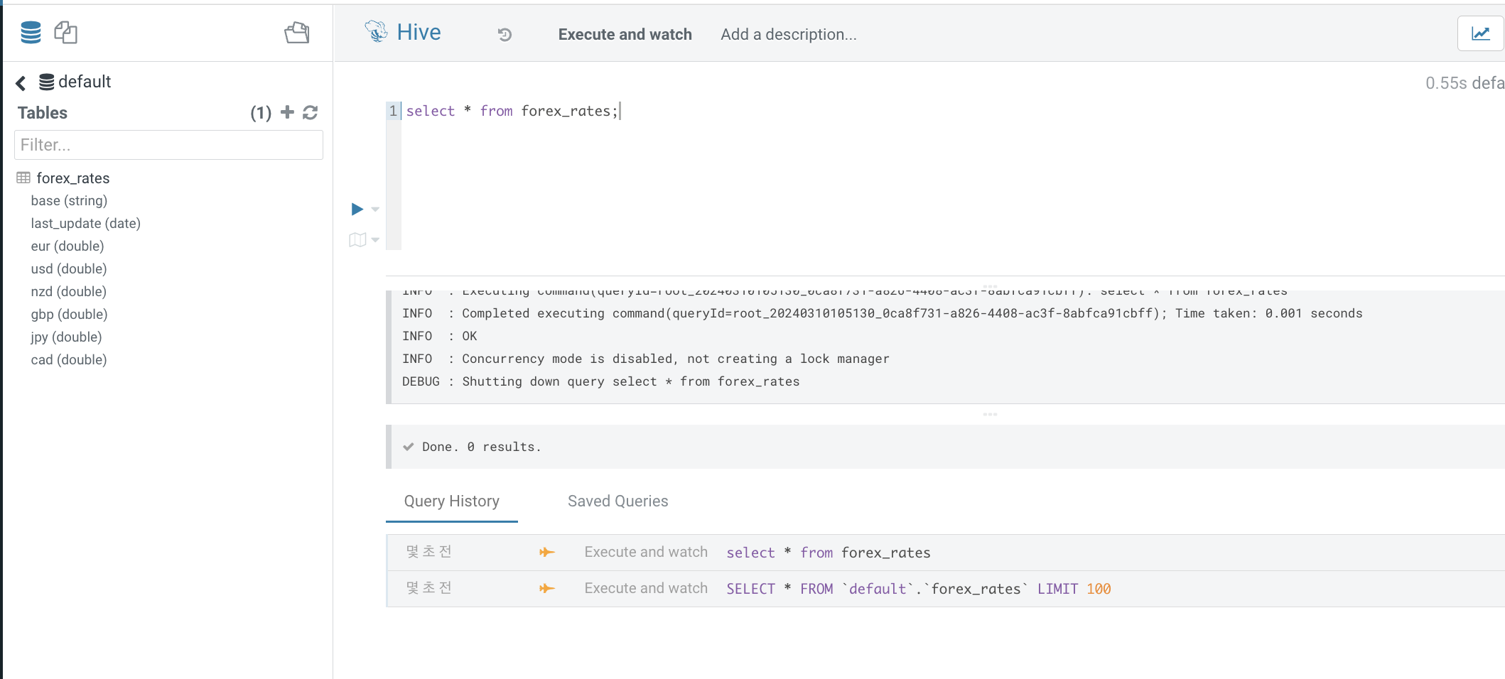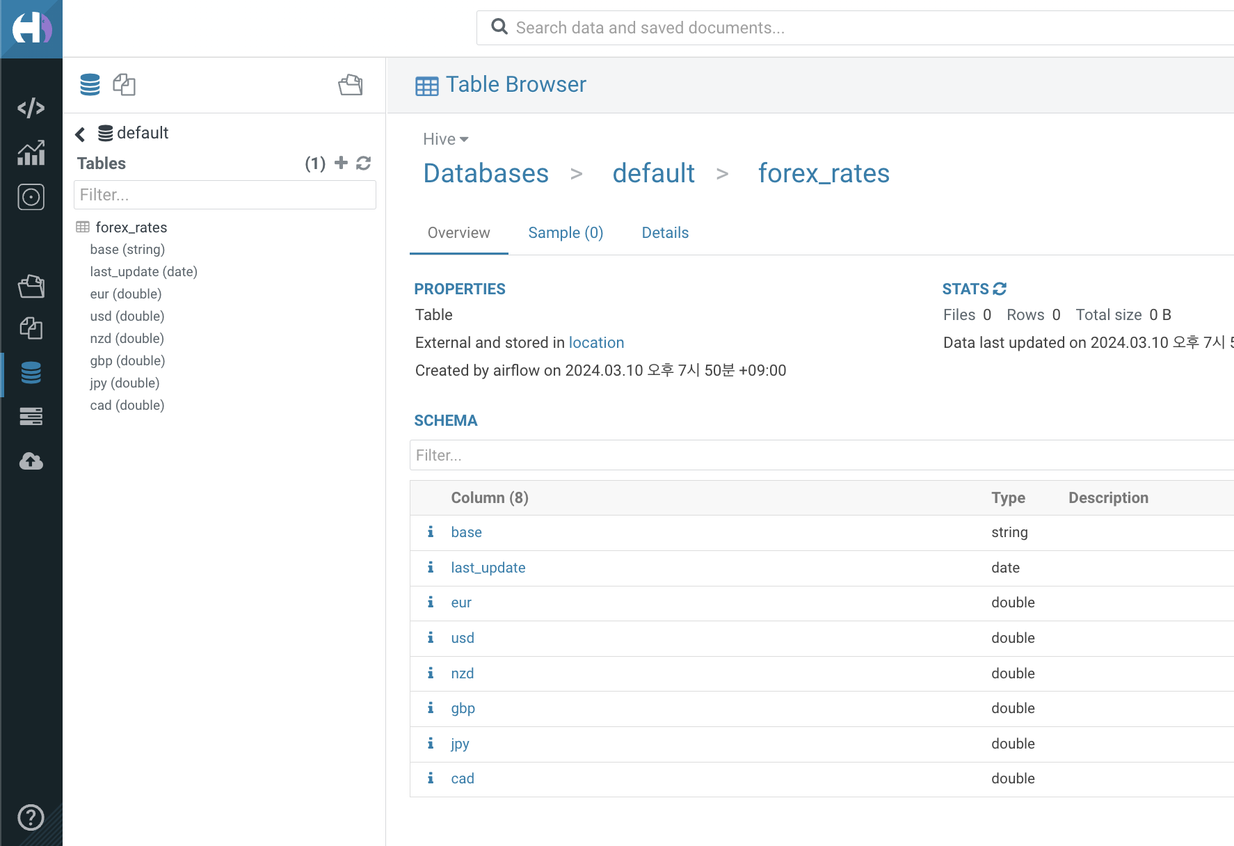 하이브에 테이블이 만들어졌는지 hue를 통해 확인합니다.