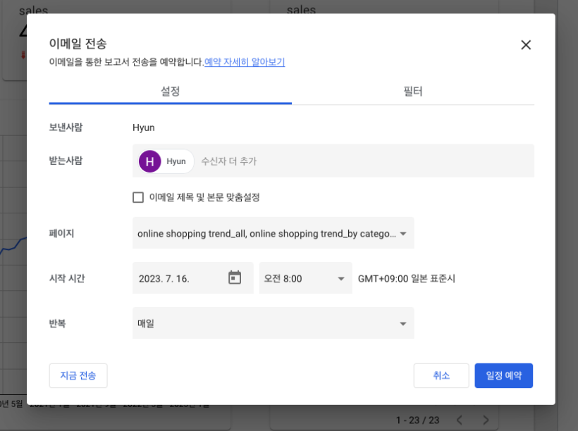 보고서 만들기 → 구글 스프레드시트 연결 후 데이터 선택