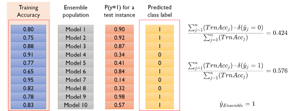 y^Ensemble=argimax(∑j=1n(TrnAccj)∑j=1n(TrnAccj)⋅δ(y^j=i)),i∈{0,1}