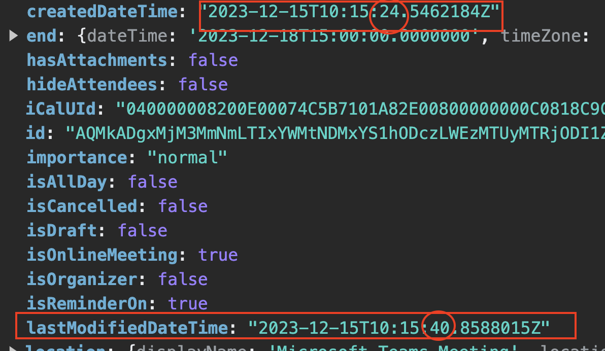 createdDateTime과 lastModifiedDateTime을 비교해서 일정 변동 사항을 감지하였더니 시간 기준이라 애로사항이 있었다.