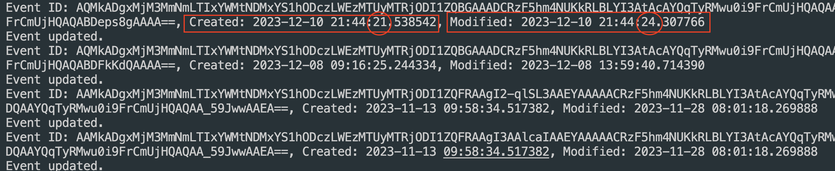 알고보니 처음 만들어진 일정도 createdDateTime과 lastModifiedDateTime이 미묘하게 다른 것이었습니다.