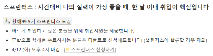 스프린터스 지원완료하였습니다. 챌린저스를 고려해보지 않은건 아니지만, 실질적으로 본인의 집중도가 한계에 달했다는 판단이 들어서 우선 취업에 집중해보기로 결정하였습니다. 취업 후 업무를 배우며 부족한 부분을 공부하고 싶은게 현재 바램입니다.