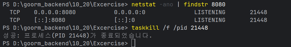 。8080 포트를 사용하는프로세스검색 시netstat -ano | findstr 8080 taskkill /f /pid PID명