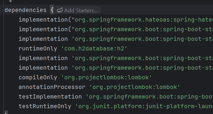 。build.gradle의dependencies{}에 정의된Add Starters클릭