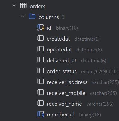 ▶ OrderEntity가 Mapping한 Orders 테이블에 POJO에서 정의된 field가 Column으로 정의됨을 확인가능
