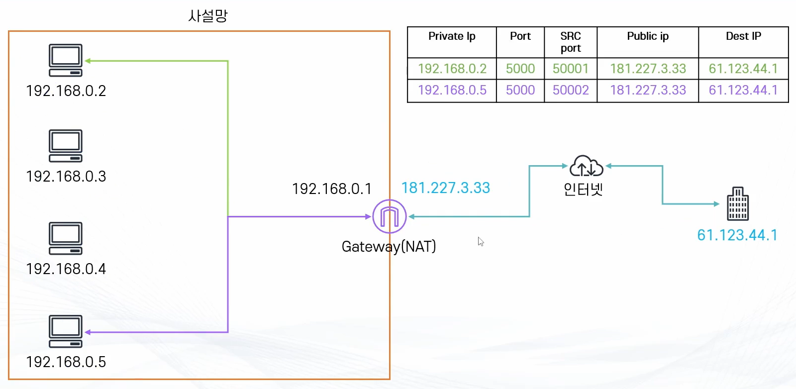 。 사설망 내 Private IPv4 주소 ( 192.168.0.2 )를 Gateway를 통해 Public IPv4 주소 ( 181.227.3.33 )의 50001 포트를 통해 외부 Host와 통신하도록 설정