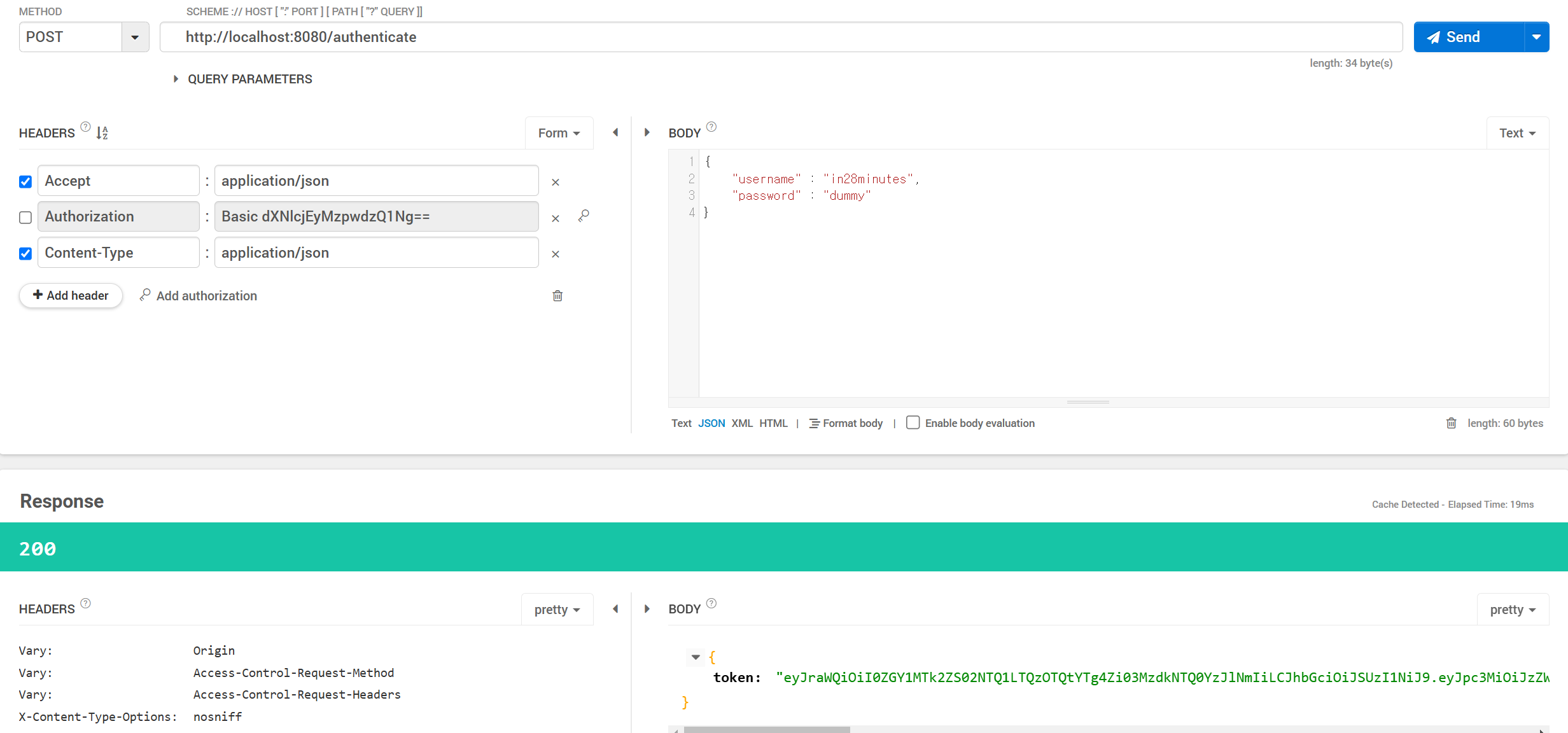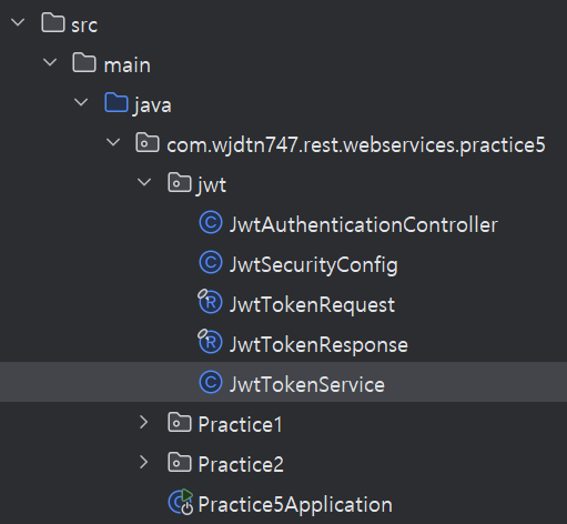 JWTJava 파일들을 Spring 진입점 Class의Sub package에 위치 지정 후JWT Token을 생성하기 위해Talend API로http://localhost:8080/authenticate로 다음 구문을HTTP Request Body로 포함하여POST HTTP Request를 전송.{ "username" : "in28minutes", "password" : "dummy" }