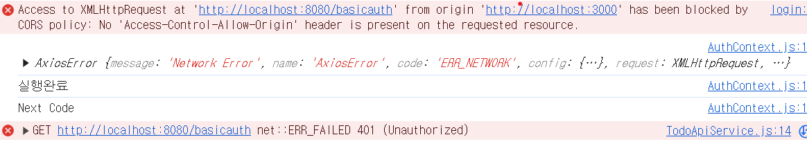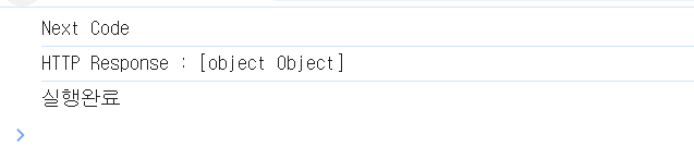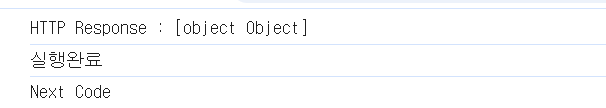 。Axios HTTP Method의 경우Promise를 return하며Promise는Callback Method가 전부 실행완료되기전에 비동기로 다음 구문을 실행하는 특징을 지님.const baCode = 'Basic ' + window.btoa(username + ':' + password) testAuthenticateApi(baCode) .then((response)=>{console.log("HTTP Response : "+response)}) // .catch((error)=>{console.log(error)}) .finally(()=>{console.log("실행완료")}) console.log("Next Code")