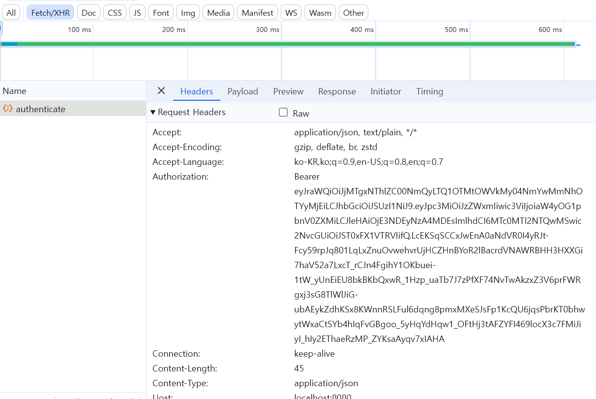 ▶Fetch/XHR의HTTP Request를 확인 시 로그인 시 입력한ID,PW를payload로서 확인 및Authorization header로서 포함된JWT Token을 확인 가능.