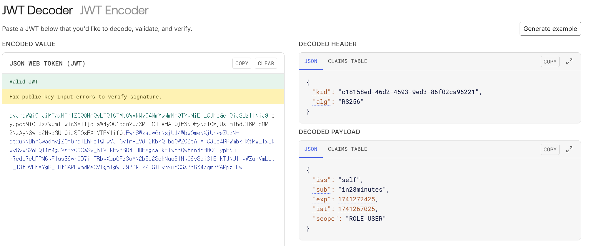 。생성된JWT Token 코드를 jwt.io에 입력 시 다음처럼header,payload,signature의 3개 구조로 사용자가 확인하기 용이하도록 표현.