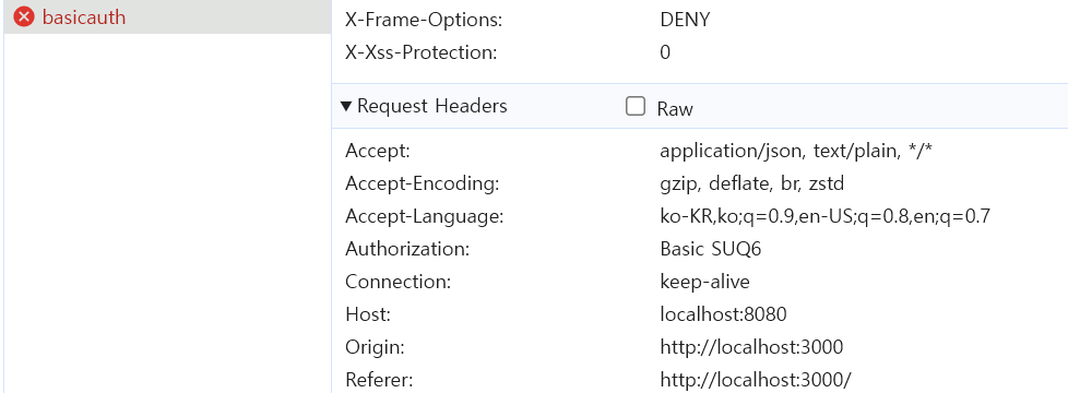 。검사-Network-Fetch/XHR에서HTTP Request의URL Parameter( =basicauth)의Headers를 확인할 경우 다음처럼Authorization Header에React에서 전송한Base64코드가 포함되어있음을 확인 가능.