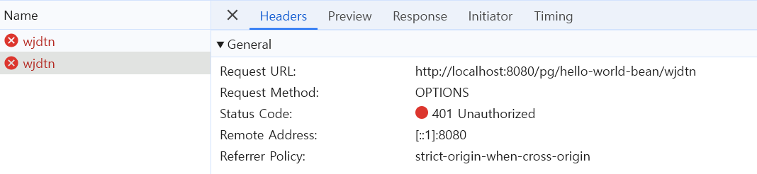 。API호출 시검사-Network에서OPTIONS Request Method의Preflight Request가 우선적으로 전송되는것을 확인 할 수 있으며, 이후 실제HTTP Request가 전송되는것을 확인 가능.