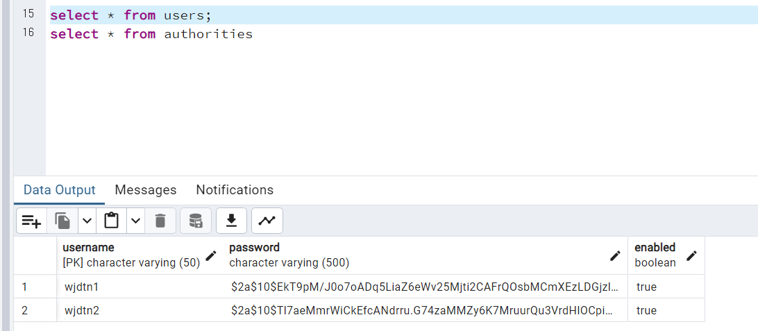 。PostgreSQL DB DataSourceinstance를 생성하는@Bean Method구현 및 해당 method를 통해 생성된 instance로JdbcUserDetailsManager(DataSource객체)의 instance를 생성하여UserDetailsinstance를 추가한 후Spring Bean으로 반환.